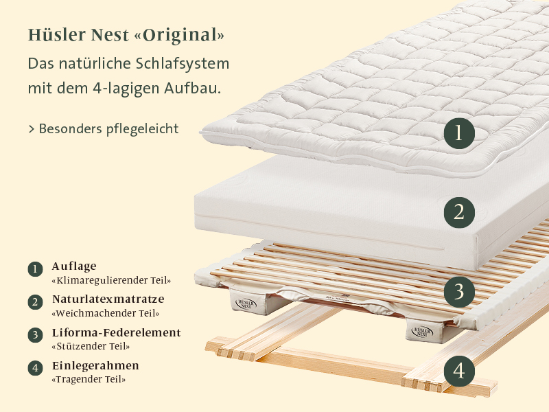 Das Hüsler Nest bietet Ihnen die Lösung für einen besseren Schlaf. Mit seinem innovativen Liforma-Federelement und der natürlichen Materialien, bietet es nicht nur unvergleichlichen Komfort, sondern unterstützt auch Ihre Wirbelsäule ergonomisch korrekt während des Schlafs. Egal, ob Sie gross, klein, schwer oder leicht sind, das Hüsler Nest passt sich Ihrem Körperindividuell an.