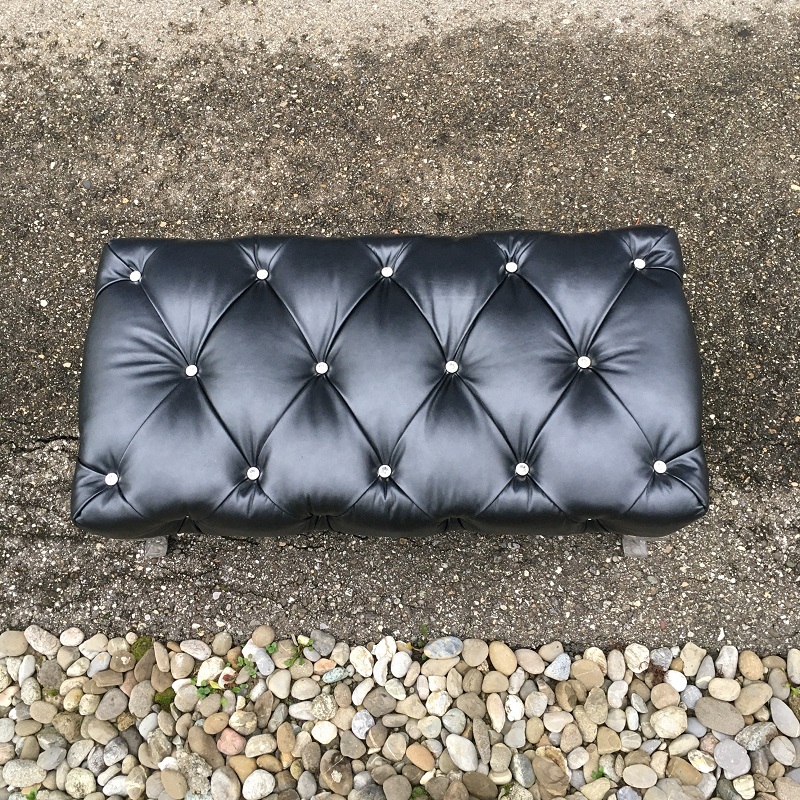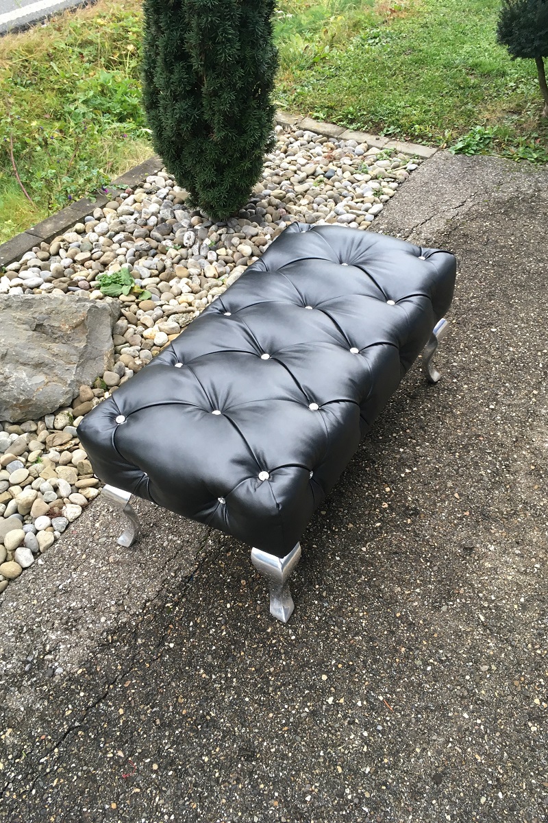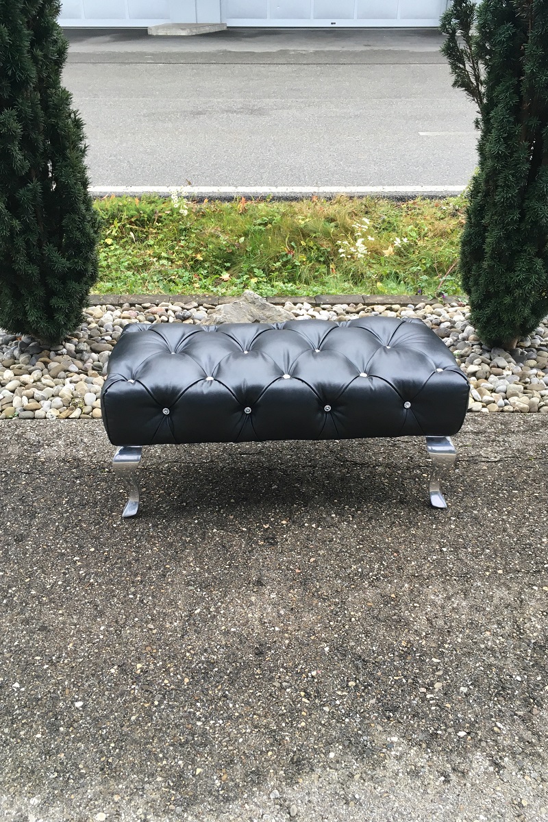 Das Marilyn Programm von Bretz glitzert und glänzt, besonders wenn die Knöpfe aus edlen Swarovsky Steinen gefertigt sind. Wir frischen auch solche Exklusivitäten sehr gerne neu in Ihrem Wunschstoff oder Leder auf. Den schwarzen Hocker Marilyn durften wir für einen Stofflieferanten neu beziehen. Als Bezug wählte die Kundschaft ein edles, schwarzes Nappaleder mit Metalliceffekt. Wunderschön passend zu den Swarovsky Knöpfen.