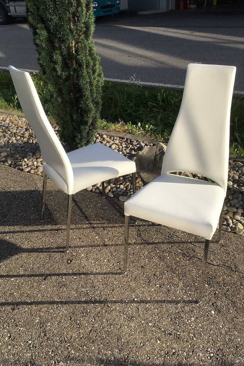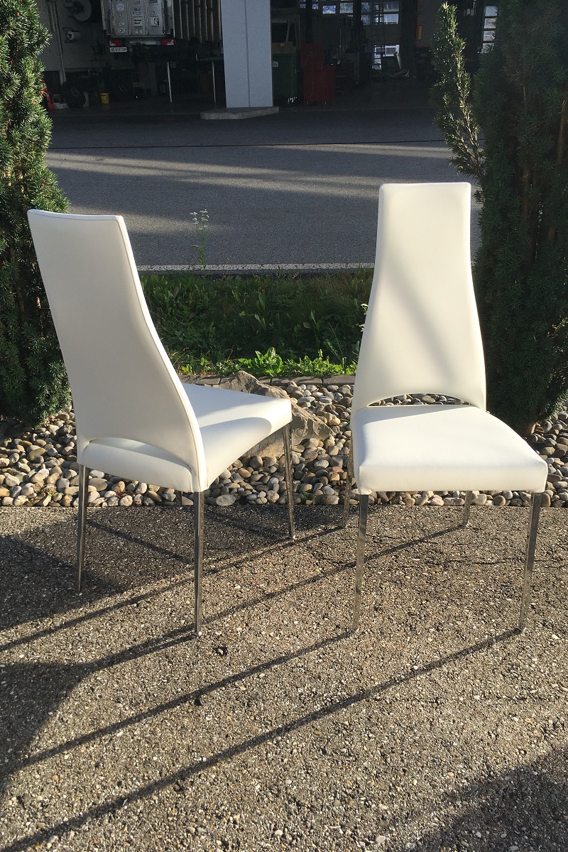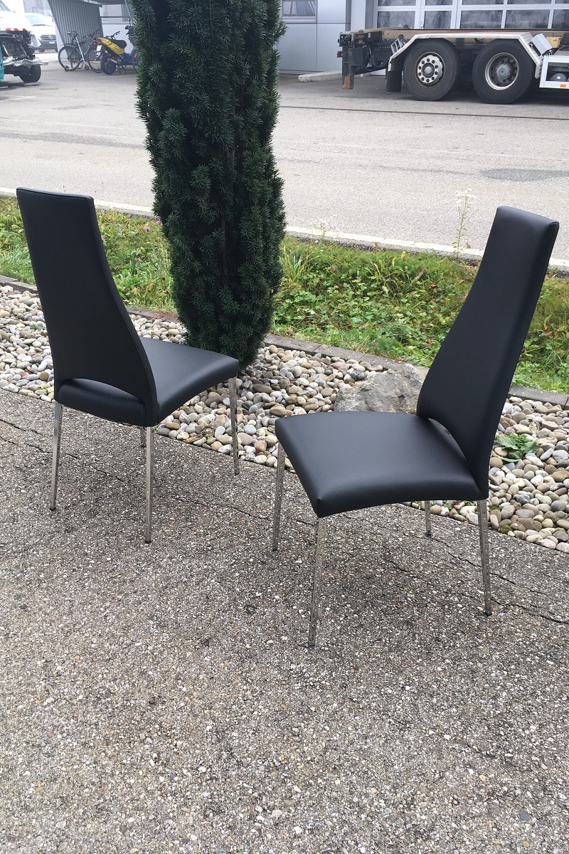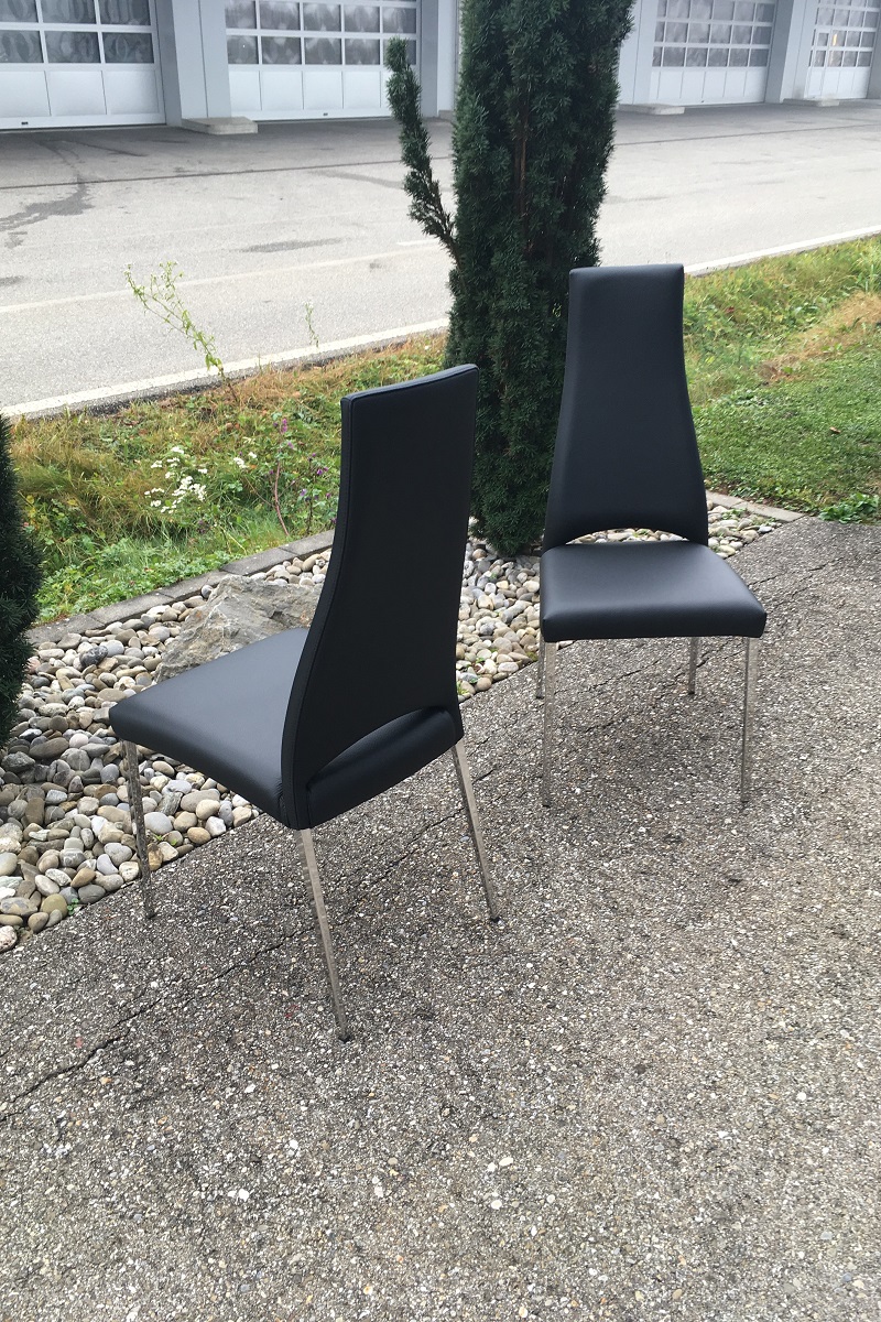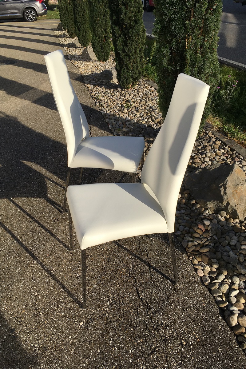 Diese schönen Stühle von Calligaris aus Italien haben neu nicht viel gekostet, es war auch ein billiges Kunstleder verarbeitet - so kahm der Kunde nun zu uns und lies die Stühle mit echtem Leder neu beziehen. Dies hat natürlich etliches mehr gekostet als der damalige Neupreis war, jedoch sind die Stühle nun auch in echtem Leder bezogen und neu mit besserem Schaum gepolster - dies darf man nicht vergessen.