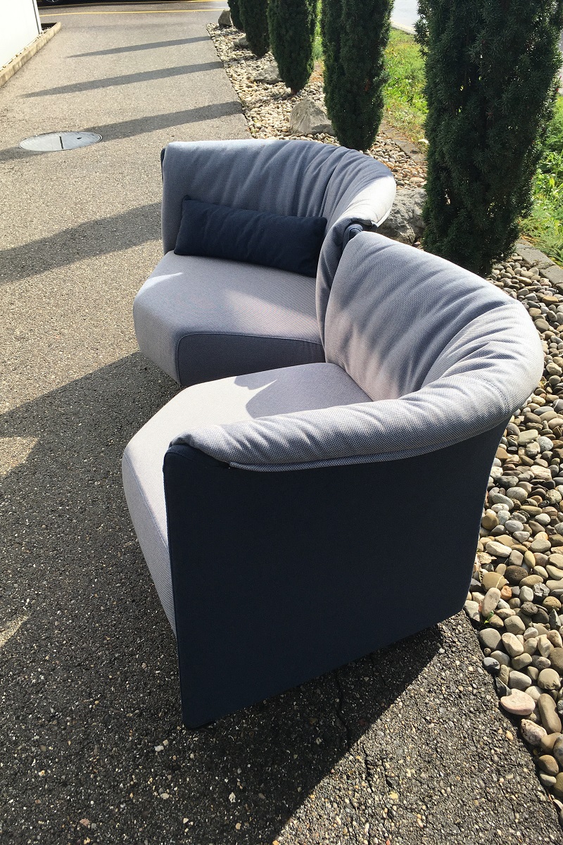 Das Designstück SAMPAN - Sofa oder Sessel? - von Cassina, ist eine relativ unbekannte Polstergruppen-Lounge des bekannten italienischen Design Herstellers. Der Entwurf stammt von Piero de Martini. Die beiden Sesselelemente haben wir in Stoff Arno (Création Baumann AG) und Linen FR (Englisch Dekor) neu überziehen dürfen - 2-farbig, genau so, wie das Original oft anzutreffen ist. Herrlich, wie warm und freundlich diese Stoffkombination wirkt.