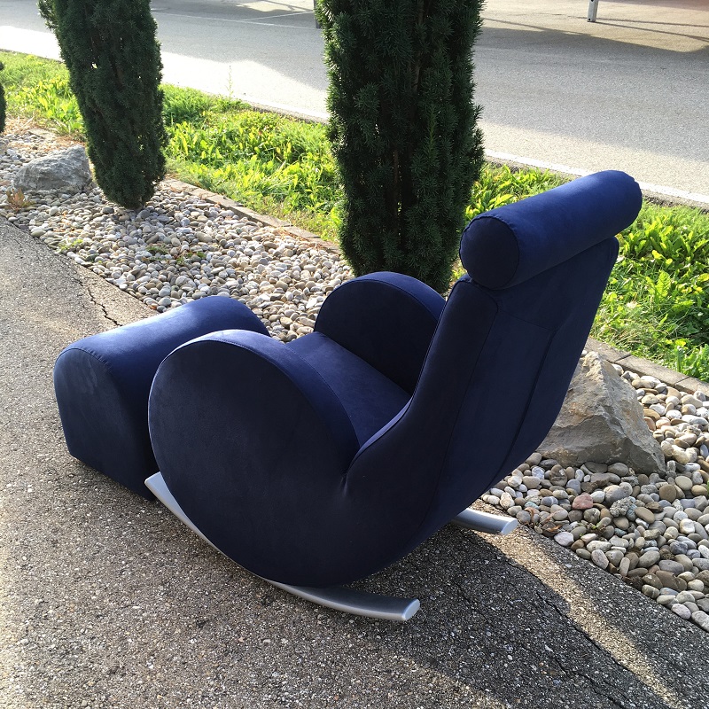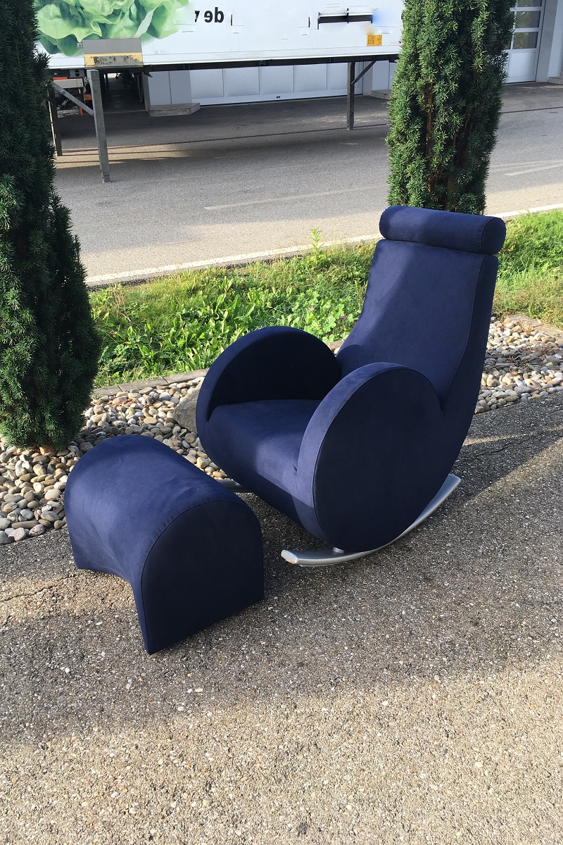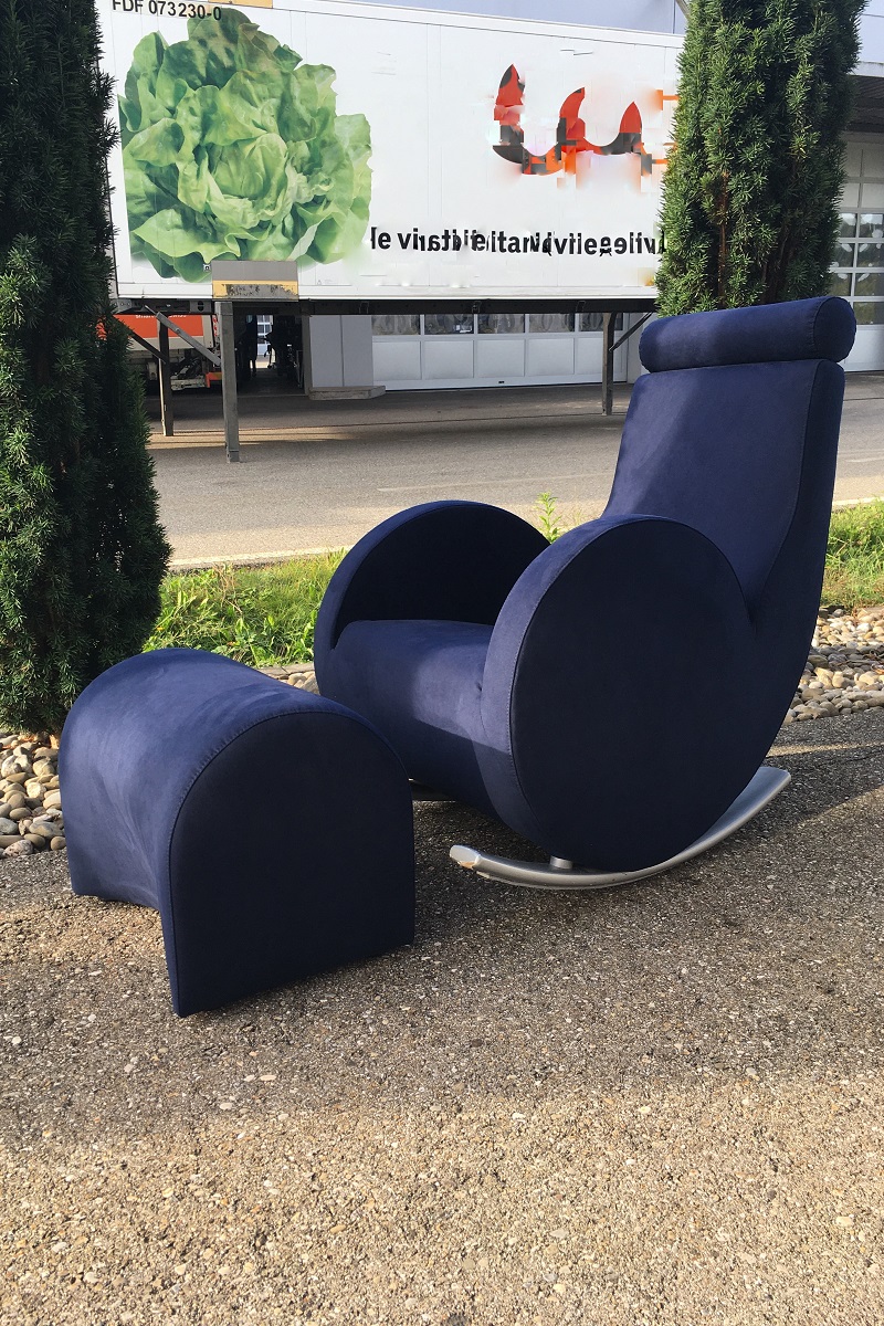 Dieser unbekannte NoName Schaukelsessel mit Hocker hat einfach viel zu schöne Rundungen, um weggeworfen zu werden! ...nur weil der Bezug nicht mehr schön aussieht, ist das auch kein Grund dafür! Das findet unser Kunde aus Murgenthal genauso, wie wir, sehr treffend uns wahr. Also verpassen wir dem Schönling kurzerhand ein neues Gewand - diesmal in Dinamica® dunkelblau, dieses Material eignet sich perfekt für diese Rundungen und liegt sehr schön und satt auf dem Polster. Dinamica® ist, entsprechend unseren langjährigen Erfahrungen, das absolut beste Mikrofasermaterial auf dem Markt, und aus 17% reinem PET-Recycling hergestellt (Italien) ist es auch ein Nachhaltiges Produkt - da hat es sogar das bekannte Alcantara® sehr schwer!