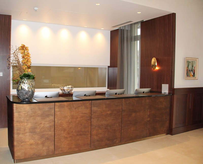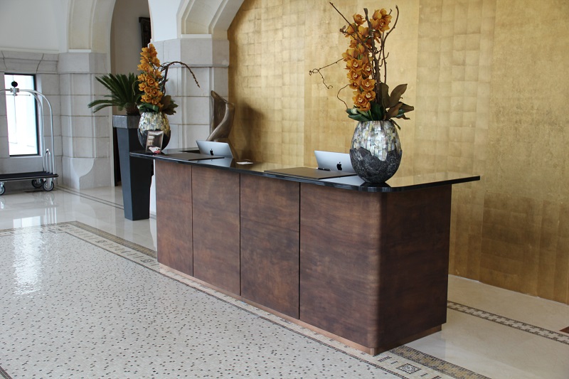 Unsere Polsterer beziehen, in der Polsterei aus dem Kanton Bern, die Receptionstheken in Stachelrochen geprägten Rindsleder nach Vorgabe des Architekten neu. Das Leder wurde durch uns speziell für dieses Objekt von den USA importiert.
