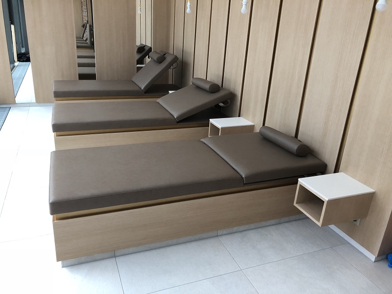 Für das Objekt Hotel Eden in Spiez konnten wir durch eine kreative Agentur nach Mass und Kundenwunsch Sitzbänke, sowie im Wellnessbereich die Ruheliegen anfertigen. Die Herstellung des Polsters in hochwertigem Kaltschaum und Polyether sowie der Bezug in Kunstleder decovin® nappa der Firma Winter Création AG war ein Muss, da das Material sehr strapazierfähig und pflegeleicht sein musste. Die Füsse und Sockelelemente der Bänke und die Unterbaukorpusse der Liegen fertigte einer unserer Schreiner und baute das Ganze vor Ort auch ein. Die kompakten Bankelemente sind äusserst mobil und jederzeit verschiebbar, sodass das Restaurantpersonal des Hotels nach Lust und Laune ihr Interieur jederzeit und im handumdrehen umgestalten kann. Diese speziellen Objekt Bankelemente sind rundherum schön verarbeitet - so, dass die geforderte Mobilität garantiert ist und die Bänke immer im besten Licht stehen.